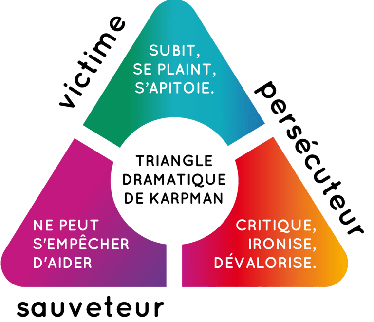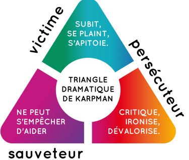 Le triangle de Karpman (ou triangle dramatique) est un schéma relationnel représentatif de jeux psychologiques dans lesquels nous revêtons différents rôles : Victime, Sauveur, ou Persécuteur.